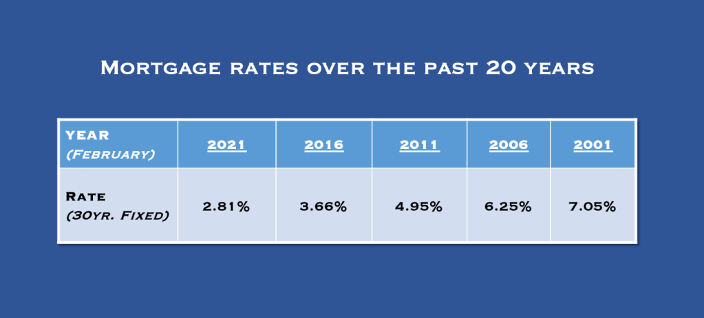 We are all aware that interest rates have been at an all-time low recently. This has been great for the real estate industry because even with it being a seller’s market (low inventory and multiple offers), the low rates have kept buyers in the game. For some historical context, see the table below.